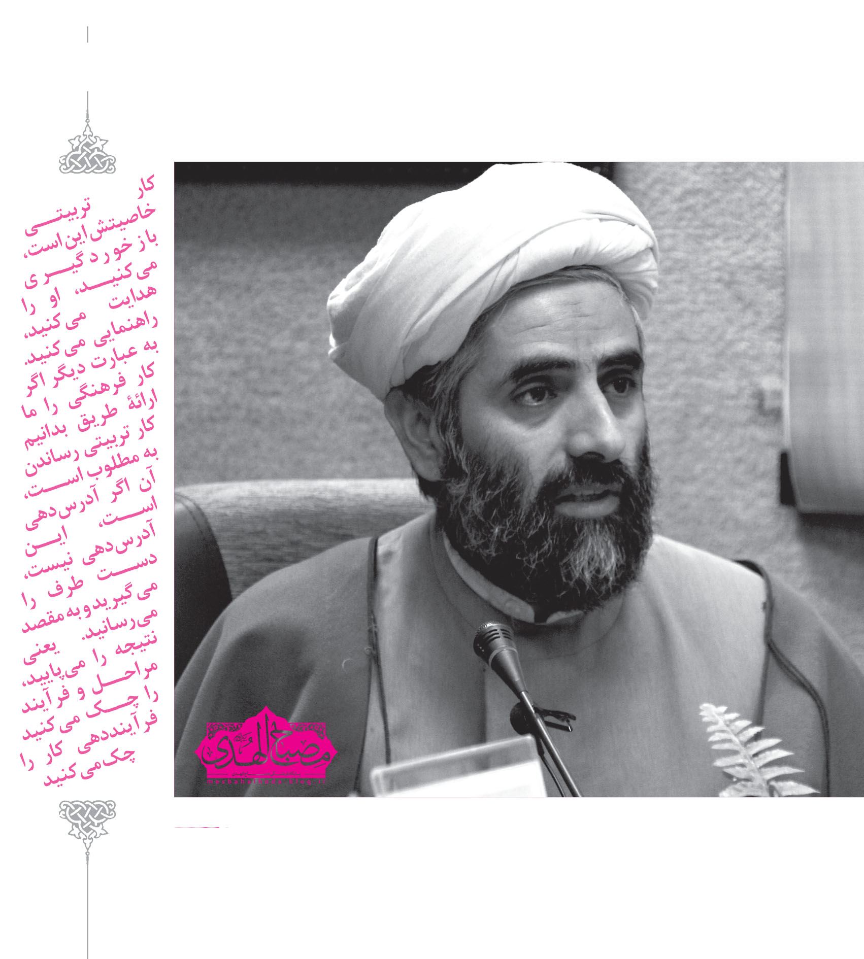 به عبارت دیگر اگر کار فرهنگی را ما ارائة طریق بدانیم کار تربیتی رساندن به مطلوب است، آن اگر آدرسدهی است، این آدرسدهی نیست، دست طرف را میگیرید و به مقصد میرسانید. یعنی نتیجه را میپایید، مراحل و فرآیند را چک میکنید فرآینددهی کار را چک میکنید دقیقاً که به کجا رسیدید؟