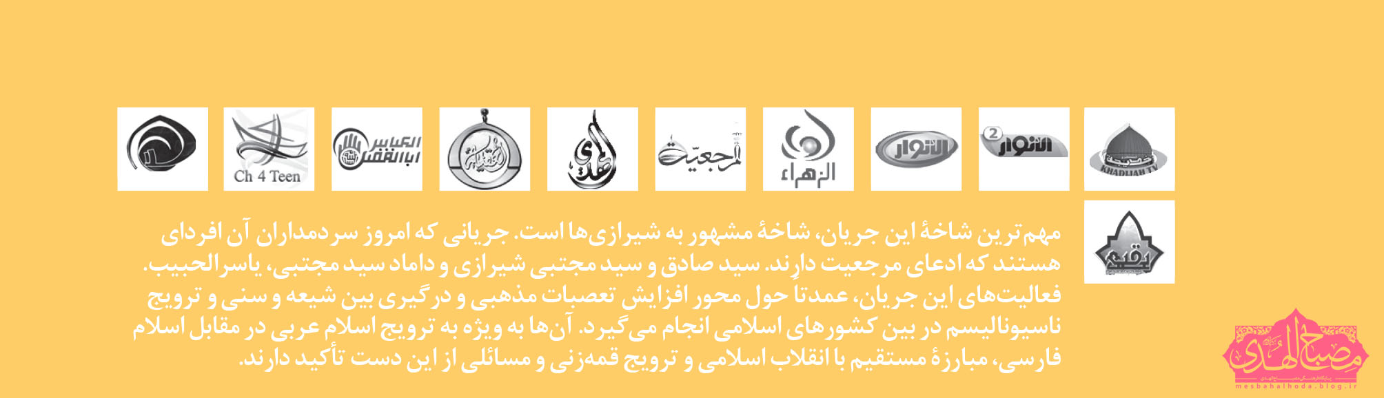 مرجعیت مورد حمایت انگلیس مهمترین شاخة این جریان، شاخة مشهور به شیرازیها است. جریانی که امروز سردمداران آن افردای هستند که ادعای مرجعیت دارند. سید صادق و سید مجتبی شیرازی و داماد سید مجتبی، یاسرالحبیب. فعالیتهای این جریان، عمدتاً حول محور افزایش تعصبات مذهبی و درگیری بین شیعه و سنی و ترویج ناسیونالیسم در بین کشورهای اسلامی انجام میگیرد. آنها به ویژه به ترویج اسلام عربی در مقابل اسلام فارسی، مبارزة مستقیم با انقلاب اسلامی و ترویج قمهزنی و مسائلی از این دست تأکید دارند. هزینههای فراوان و پولهای کلان و حمایتهای استکباری زیادی از آنها صورت میگیرد. شبکههای ماهوارهای که این جریان به راه انداخته، مانند شبکه کربلا، شبکه الانوار، شبکه امام حسین(علیه السلام)، شبکه اهلبیت که توسط یک طلبة افغانی به نام اللهیاری اداره میشود و شبکههای دیگر به زبانهای فارسی، عربی، اردو، انگلیسی و ترکی از جمله فعالیتهای رسانهای آنهاست. راهاندازی چندین روزنامه در کشورهای اسلامی مثل کویت، عراق، بحرین و راهاندازی هزاران سایت و وبلاگ اینترنتی و چندین مرکز اسلامی در عراق، افغانستان، آمریکا، جنوب آسیا و بسیاری از کشورهای دیگر دنیا از دیگر فعالیتهای آنهاست. اخیراً هم سرمایهگذاری عجیبی روی کشورهای آفریقایی را آغاز کردهاند. برای نمونه یاسرالحبیب در شبکه فدک، جریان اهانتآمیز عجیبی را علیه عایشه همسر پیامبر به راه انداخت که در جهان اسلام به ضرر ما تمام شد و هنوز هم گروههای تکفیری با همین فیلمها و سخنرانیها دارند برای مبارزه در سوریه عضوگیری میکنند. این فرد دو سال قبل کمک مالی کلانی از وزارت امور خارجه انگلستان دریافت کرد. درحالیکه کشورهای اروپایی شبکههای بینالمللی ما را میبندند و شبکه المنار حزبالله در بسیاری از ماهوارهها توقیف شده و اجازة پخش ندارد، شبکههای اینها با بهترین خدمات دارد توسط کشورهای اروپایی و آمریکایی حمایت میشود. این فعالیتهای رسانهای تنفر و درگیری را بین مسلمانان گسترش میدهد. هر کجا انقلاب اسلامی پیام خودش را به آنجا برده و هر کجا شیعیانی با تفکر انقلاب اسلامی دارند حرکت میکنند، اینها پایشان آنجا باز میشود و شروع به فعالیت میکنند. نکتة مهم دفاتر آنها در انگلستان است که عمدتاً به طور رسمی مورد حمایت کشورهای مختلفاند.